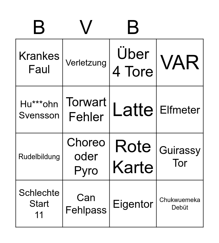 This bingo card has 16 words: Can Fehlpass, Guirassy Tor, Über 4 Tore, Krankes Faul, Rudelbildung, Verletzung, Rote Karte, Eigentor, Hu***ohn Svensson, Torwart Fehler, Schlechte Start 11, VAR, Choreo oder Pyro, Elfmeter, Latte and Chukwuemeka Debüt.
