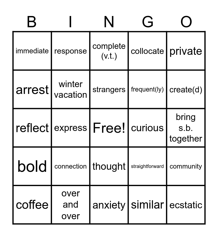 This bingo card has a free space and 24 words: connection, over and over, strangers, coffee, private, immediate, arrest, response, curious, thought, frequent(ly), reflect, straightforward, community, winter vacation, similar, bring s.b. together, complete (v.t.), create(d), express, ecstatic, bold, collocate and anxiety.