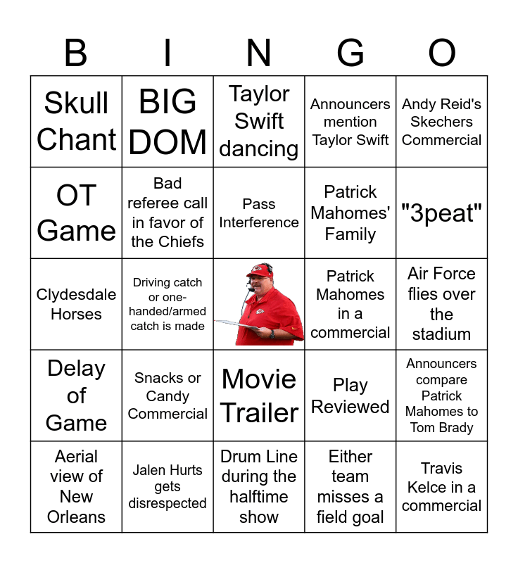 This bingo card has a free space and 24 words: Aerial view of New Orleans, Snacks or Candy Commercial, Pass Interference, Either team misses a field goal, Andy Reid's Skechers Commercial, Skull Chant, BIG DOM, Taylor Swift dancing, Patrick Mahomes in a commercial, Air Force flies over the stadium, Clydesdale Horses, Bad referee call in favor of the Chiefs, Play Reviewed, Announcers compare Patrick Mahomes to Tom Brady, ОТ Game, Jalen Hurts gets disrespected, Drum Line during the halftime show, Announcers mention Taylor Swift, "3peat", Delay of Game, Driving catch or one- handed/armed catch is made, Movie Trailer, Patrick Mahomes' Family and Travis Kelce in a commercial.