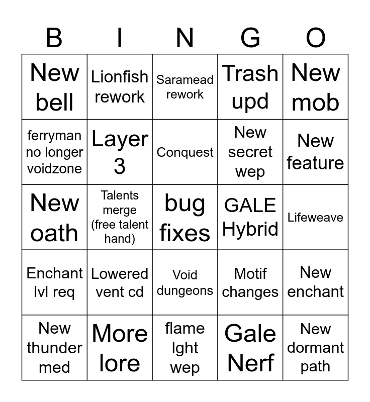 This bingo card has a free space and 24 words: New thunder med, Lowered vent cd, Conquest, Gale Nerf, New mob, New bell, Lionfish rework, Saramead rework, GALE Hybrid, Lifeweave, New oath, Layer 3, Motif changes, New enchant, ferryman no longer voidzone, More lore, flame lght wep, Trash upd, New feature, Enchant lvl req, Talents merge (free talent hand), Void dungeons, New secret wep and New dormant path.