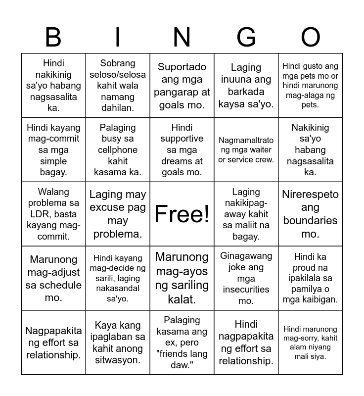 This bingo card has a free space and 50 words: Laging galit kahit walang dahilan., Hindi marunong mag-sorry, kahit alam niyang mali siya., Laging late, wala man lang text or tawag., Palaging kasama ang ex, pero "friends lang daw.", Hindi kayang mag-decide ng sarili, laging nakasandal sa'yo., Hindi siya naglilinis ng sarili niyang kalat., Sobrang seloso/selosa kahit wala namang dahilan., Walang plano para sa future, “bahala na si Batman” attitude., Hindi kayang mag-commit sa mga simple bagay., Ayaw mag-open ng conversation tungkol sa feelings., Palaging busy sa cellphone kahit kasama ka., Laging inuuna ang barkada kaysa sa'yo., Hindi ka proud na ipakilala sa pamilya o mga kaibigan., Ginagawang joke ang mga insecurities mo., Sobrang clingy to the point na wala ka ng breathing space., Hindi marunong magtipid, gastos dito, gastos doon., Hindi supportive sa mga dreams at goals mo., Laging nakikipag-away kahit sa maliit na bagay., Minsan parang hindi ka importante, on-off ang pakikitungo., Hindi gusto ang mga pets mo or hindi marunong mag-alaga ng pets., Laging may excuse pag may problema., Hindi nagpapakita ng effort sa relationship., Hindi nakikinig sa'yo habang nagsasalita ka., Nagmamaltrato ng mga waiter or service crew., Laging humihingi ng pera pero hindi nagbabayad., Marunong magpasalamat kahit sa maliliit na bagay., Nakikinig sa'yo habang nagsasalita ka., Palaging on-time sa mga lakad niyo., Suportado ang mga pangarap at goals mo., Marunong mag-ayos ng sariling kalat., Proud na ipakilala ka sa pamilya at mga kaibigan., Nag-effort na ma-meet ang mga kaibigan mo., Hindi clingy, pero alam mong nandiyan siya para sa'yo., Marunong magtipid, may plano para sa future., Kaya kang ipaglaban sa kahit anong sitwasyon., Marunong mag-open up ng feelings., Mahilig sa pets at marunong mag-alaga., Hindi nagmamaltrato ng ibang tao, laging may respeto., Marunong mag-adjust para sa relationship., Nirerespeto ang boundaries mo., May sense of humor, kaya kang patawanin kahit bad trip ka., Marunong magkomunikasyon ng maayos., Nagbibigay ng space pag kailangan mo., Marunong magbuhat ng morale mo pag down ka., Nagpapakita ng effort sa relationship., Walang problema sa LDR, basta kayang mag-commit., Nagpaparamdam ng importansya kahit gaano ka busy., Hindi nagde-demand ng oras, pero nandiyan pag kailangan mo., Marunong mag-adjust sa schedule mo. and Hindi nagsisinungaling at palaging totoo sa'yo..