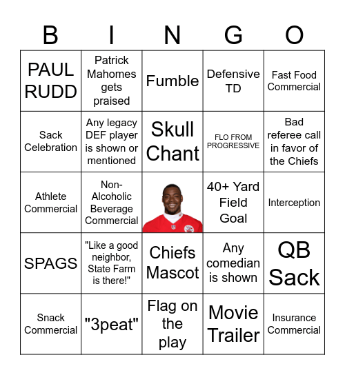 This bingo card has a free space and 24 words: Snack Commercial, "Like a good neighbor, State Farm is there!", Skull Chant, Movie Trailer, Fast Food Commercial, PAUL RUDD, Patrick Mahomes gets praised, Fumble, 40+ Yard Field Goal, Interception, Athlete Commercial, Any legacy DEF player is shown or mentioned, Any comedian is shown, QB Sack, Sack Celebration, "3peat", Flag on the play, Defensive TD, Bad referee call in favor of the Chiefs, SPAGS, Non- Alcoholic Beverage Commercial, Chiefs Mascot, FLO FROM PROGRESSIVE and Insurance Commercial.