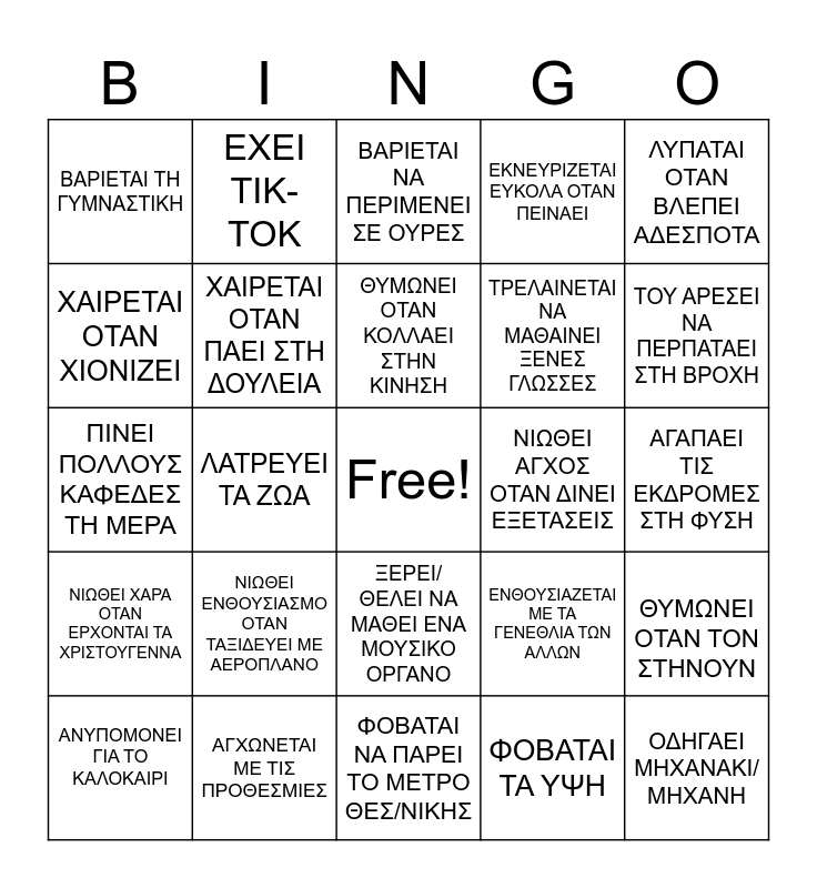 This bingo card has a free space and 24 words: ΝΙΩΘΕΙ ΕΝΘΟΥΣΙΑΣΜΟ ΟΤΑΝ ΤΑΞΙΔΕΥΕΙ ΜΕ ΑΕΡΟΠΛΑΝΟ, ΑΓΧΩΝΕΤΑΙ ΜΕ ΤΙΣ ΠΡΟΘΕΣΜΙΕΣ, ΘΥΜΩΝΕΙ ΟΤΑΝ ΚΟΛΛΑΕΙ ΣΤΗΝ ΚΙΝΗΣΗ, ΑΝΥΠΟΜΟΝΕΙ ΓΙΑ ΤΟ ΚΑΛΟΚΑΙΡΙ, ΛΥΠΑΤΑΙ ΟΤΑΝ ΒΛΕΠΕΙ ΑΔΕΣΠΟΤΑ, ΒΑΡΙΕΤΑΙ ΤΗ ΓΥΜΝΑΣΤΙΚΗ, ΧΑΙΡΕΤΑΙ ΟΤΑΝ ΧΙΟΝΙΖΕΙ, ΕΧΕΙ TIK-TOK, ΝΙΩΘΕΙ ΑΓΧΟΣ ΟΤΑΝ ΔΙΝΕΙ ΕΞΕΤΑΣΕΙΣ, ΞΕΡΕΙ/ΘΕΛΕΙ ΝΑ ΜΑΘΕΙ ΕΝΑ ΜΟΥΣΙΚΟ ΟΡΓΑΝΟ, ΤΡΕΛΑΙΝΕΤΑΙ ΝΑ ΜΑΘΑΙΝΕΙ ΞΕΝΕΣ ΓΛΩΣΣΕΣ, ΠΙΝΕΙ ΠΟΛΛΟΥΣ ΚΑΦΕΔΕΣ ΤΗ ΜΕΡΑ, ΕΝΘΟΥΣΙΑΖΕΤΑΙ ΜΕ ΤΑ ΓΕΝΕΘΛΙΑ ΤΩΝ ΑΛΛΩΝ, ΘΥΜΩΝΕΙ ΟΤΑΝ ΤΟΝ ΣΤΗΝΟΥΝ, ΧΑΙΡΕΤΑΙ ΟΤΑΝ ΠΑΕΙ ΣΤΗ ΔΟΥΛΕΙΑ, ΦΟΒΑΤΑΙ ΤΑ ΥΨΗ, ΑΓΑΠΑΕΙ ΤΙΣ ΕΚΔΡΟΜΕΣ ΣΤΗ ΦΥΣΗ, ΒΑΡΙΕΤΑΙ ΝΑ ΠΕΡΙΜΕΝΕΙ ΣΕ ΟΥΡΕΣ, ΤΟΥ ΑΡΕΣΕΙ ΝΑ ΠΕΡΠΑΤΑΕΙ ΣΤΗ ΒΡΟΧΗ, ΛΑΤΡΕΥΕΙ ΤΑ ΖΩΑ, ΟΔΗΓΑΕΙ ΜΗΧΑΝΑΚΙ/ΜΗΧΑΝΗ, ΝΙΩΘΕΙ ΧΑΡΑ ΟΤΑΝ ΕΡΧΟΝΤΑΙ ΤΑ ΧΡΙΣΤΟΥΓΕΝΝΑ, ΕΚΝΕΥΡΙΖΕΤΑΙ ΕΥΚΟΛΑ ΟΤΑΝ ΠΕΙΝΑΕΙ and ΦΟΒΑΤΑΙ ΝΑ ΠΑΡΕΙ ΤΟ ΜΕΤΡΟ ΘΕΣ/ΝΙΚΗΣ.