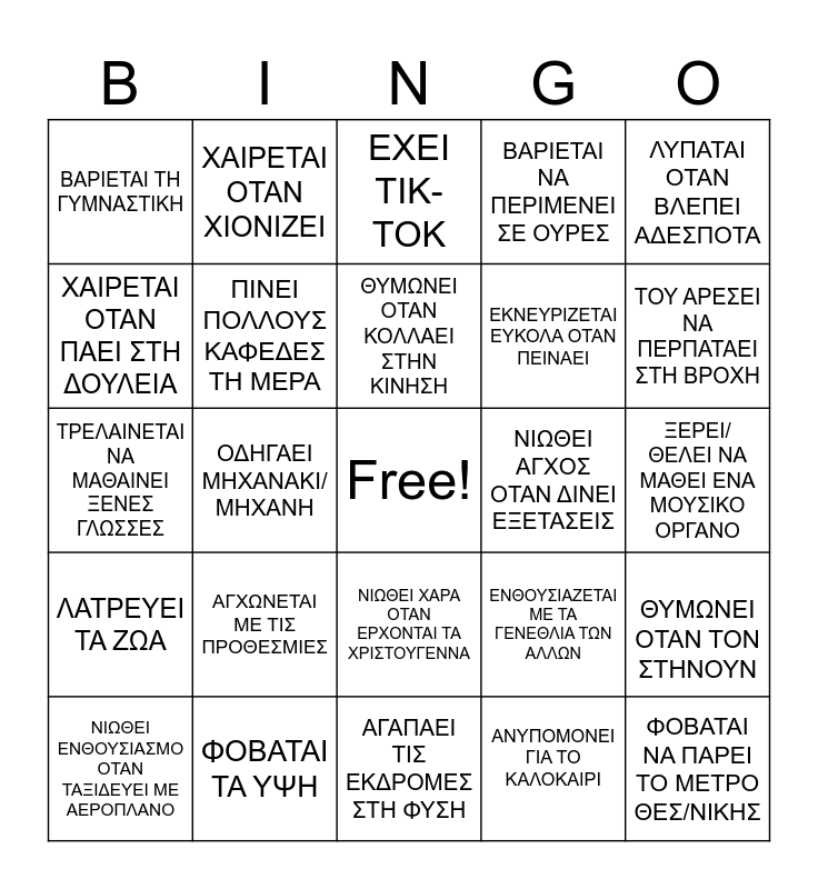 This bingo card has a free space and 24 words: ΝΙΩΘΕΙ ΕΝΘΟΥΣΙΑΣΜΟ ΟΤΑΝ ΤΑΞΙΔΕΥΕΙ ΜΕ ΑΕΡΟΠΛΑΝΟ, ΑΓΧΩΝΕΤΑΙ ΜΕ ΤΙΣ ΠΡΟΘΕΣΜΙΕΣ, ΘΥΜΩΝΕΙ ΟΤΑΝ ΚΟΛΛΑΕΙ ΣΤΗΝ ΚΙΝΗΣΗ, ΑΝΥΠΟΜΟΝΕΙ ΓΙΑ ΤΟ ΚΑΛΟΚΑΙΡΙ, ΛΥΠΑΤΑΙ ΟΤΑΝ ΒΛΕΠΕΙ ΑΔΕΣΠΟΤΑ, ΒΑΡΙΕΤΑΙ ΤΗ ΓΥΜΝΑΣΤΙΚΗ, ΧΑΙΡΕΤΑΙ ΟΤΑΝ ΧΙΟΝΙΖΕΙ, ΕΧΕΙ TIK-TOK, ΝΙΩΘΕΙ ΑΓΧΟΣ ΟΤΑΝ ΔΙΝΕΙ ΕΞΕΤΑΣΕΙΣ, ΞΕΡΕΙ/ΘΕΛΕΙ ΝΑ ΜΑΘΕΙ ΕΝΑ ΜΟΥΣΙΚΟ ΟΡΓΑΝΟ, ΤΡΕΛΑΙΝΕΤΑΙ ΝΑ ΜΑΘΑΙΝΕΙ ΞΕΝΕΣ ΓΛΩΣΣΕΣ, ΠΙΝΕΙ ΠΟΛΛΟΥΣ ΚΑΦΕΔΕΣ ΤΗ ΜΕΡΑ, ΕΝΘΟΥΣΙΑΖΕΤΑΙ ΜΕ ΤΑ ΓΕΝΕΘΛΙΑ ΤΩΝ ΑΛΛΩΝ, ΘΥΜΩΝΕΙ ΟΤΑΝ ΤΟΝ ΣΤΗΝΟΥΝ, ΧΑΙΡΕΤΑΙ ΟΤΑΝ ΠΑΕΙ ΣΤΗ ΔΟΥΛΕΙΑ, ΦΟΒΑΤΑΙ ΤΑ ΥΨΗ, ΑΓΑΠΑΕΙ ΤΙΣ ΕΚΔΡΟΜΕΣ ΣΤΗ ΦΥΣΗ, ΒΑΡΙΕΤΑΙ ΝΑ ΠΕΡΙΜΕΝΕΙ ΣΕ ΟΥΡΕΣ, ΤΟΥ ΑΡΕΣΕΙ ΝΑ ΠΕΡΠΑΤΑΕΙ ΣΤΗ ΒΡΟΧΗ, ΛΑΤΡΕΥΕΙ ΤΑ ΖΩΑ, ΟΔΗΓΑΕΙ ΜΗΧΑΝΑΚΙ/ΜΗΧΑΝΗ, ΝΙΩΘΕΙ ΧΑΡΑ ΟΤΑΝ ΕΡΧΟΝΤΑΙ ΤΑ ΧΡΙΣΤΟΥΓΕΝΝΑ, ΕΚΝΕΥΡΙΖΕΤΑΙ ΕΥΚΟΛΑ ΟΤΑΝ ΠΕΙΝΑΕΙ and ΦΟΒΑΤΑΙ ΝΑ ΠΑΡΕΙ ΤΟ ΜΕΤΡΟ ΘΕΣ/ΝΙΚΗΣ.