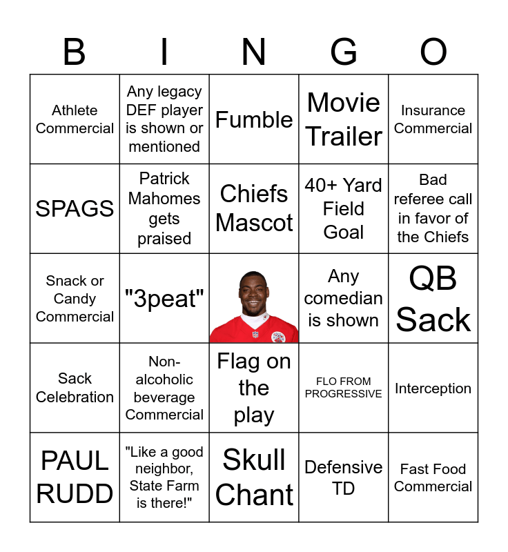 This bingo card has a free space and 24 words: PAUL RUDD, Non- alcoholic beverage Commercial, Chiefs Mascot, Defensive TD, Insurance Commercial, Athlete Commercial, Any legacy DEF player is shown or mentioned, Fumble, Any comedian is shown, QB Sack, Snack or Candy Commercial, Patrick Mahomes gets praised, FLO FROM PROGRESSIVE, Interception, SPAGS, "Like a good neighbor, State Farm is there!", Skull Chant, Movie Trailer, Bad referee call in favor of the Chiefs, Sack Celebration, "3peat", Flag on the play, 40+ Yard Field Goal and Fast Food Commercial.