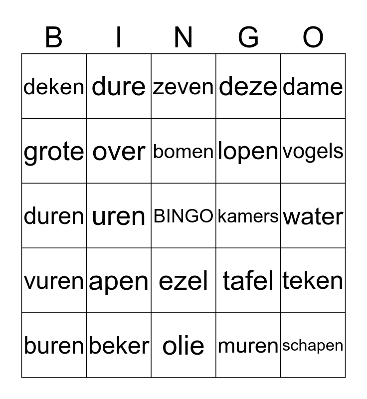 This bingo card has a free space and 24 words: apen, beker, bomen, buren, dame, deken, grote, dure, kamers, ezel, lopen, duren, tafel, teken, over, muren, water, zeven, vogels, uren, schapen, vuren, deze and olie.