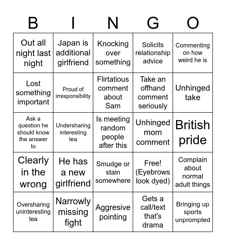 This bingo card has 25 words: He has a new girlfriend, Aggresive pointing, Flirtatious comment about Sam, Oversharing uninteresting tea, Commenting on how weird he is, Out all night last night, Lost something important, Japan is additional girlfriend, Unhinged mom comment, Smudge or stain somewhere, Take an offhand comment seriously, Ask a question he should know the answer to, Free! (Eyebrows look dyed), Complain about normal adult things, Proud of irresponsibility, Bringing up sports unprompted, British pride, Knocking over something, Unhinged take, Undersharing interesting tea, Is meeting random people after this, Narrowly missing fight, Clearly in the wrong, Solicits relationship advice and Gets a call/text that's drama.