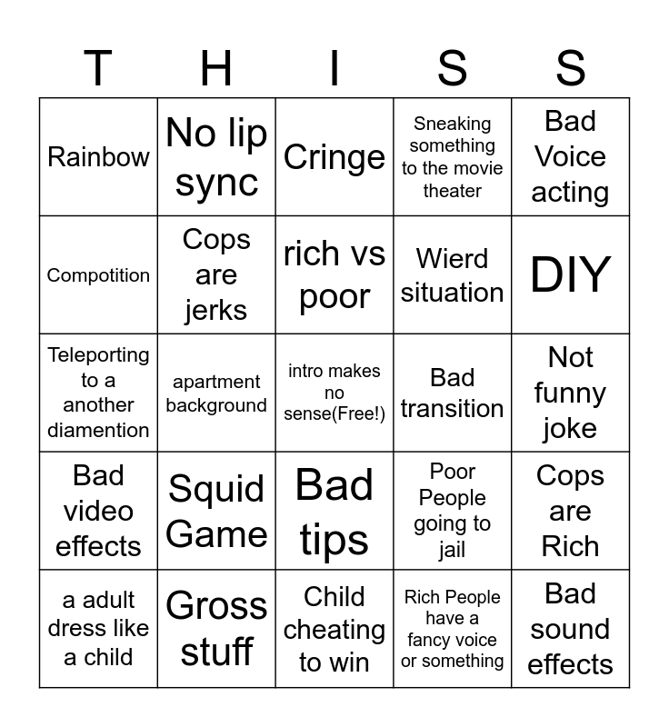 This bingo card has a free space and 24 words: Squid Game, Gross stuff, rich vs poor, a adult dress like a child, Bad Voice acting, Rainbow, Compotition, No lip sync, Bad transition, Bad tips, Wierd situation, Teleporting to a another diamention, Poor People going to jail, Cops are Rich, Cops are jerks, Rich People have a fancy voice or something, Not funny joke, Cringe, DIY, apartment background, Bad sound effects, Bad video effects, Sneaking something to the movie theater and Child cheating to win.