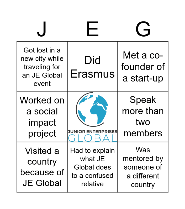 This bingo card has a free space and 8 words: Speak more than two members, Met a co-founder of a start-up, Did Erasmus, Visited a country because of JE Global, Got lost in a new city while traveling for an JE Global event, Was mentored by someone of a different country, Worked on a social impact project and Had to explain what JE Global does to a confused relative.