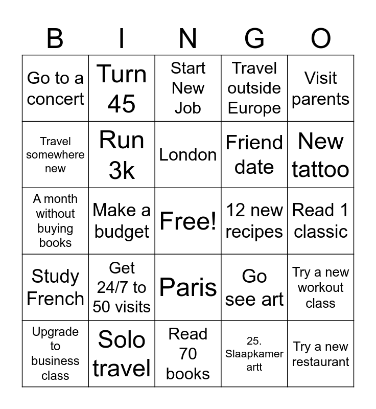 This bingo card has a free space and 25 words: Get 24/7 to 50 visits, Read 70 books, London, Upgrade to business class, Visit parents, Go to a concert, Travel somewhere new, Turn 45, 12 new recipes, Paris, Friend date, A month without buying books, Go see art, Try a new workout class, Run 3k, New York, Read 1 classic, Start New Job, New tattoo, Make a budget, Try a new restaurant, Solo travel, Study French, Travel outside Europe and 25. Slaapkamer artt.