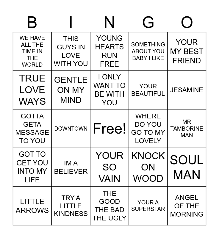 This bingo card has a free space and 44 words: MARIA, ANGEL OF THE MORNING, ZOOM, LITTLE ARROWS, DEVIL IN DISGUISE, YOUR A SUPERSTAR, YOUNG HEARTS RUN FREE, YOUR SONG, YOUR MY BEST FRIEND, TRY A LITTLE KINDNESS, SOMETHING ABOUT YOU BABY I LIKE, WHERE DO YOU GO TO MY LOVELY, YOUR SO VAIN, IM A BELIEVER, THOSE WERE THE DAYS, THE GOOD THE BAD THE UGLY, CINDERELLA ROCKAFELLA, GOTTA GETA MESSAGE TO YOU, SIMON SAYS, JESAMINE, THIS GUYS IN LOVE WITH YOU, THE BIRDS ANDTHE BEES, REACH OUT, WE HAVE ALL THE TIME IN THE WORLD, STAND BY ME, MR TAMBORINE MAN, BROWN EYED GIRL, RESCUE ME, KNOCK ON WOOD, GOT TO GET YOU INTO MY LIFE, UPTIGHT, SOUL MAN, CANT HURRY LOVE, MONY MONY, DOWNTOWN, THE SUN AINT GONNA SHINE ANYMORE, HES AINT HEAVY HES MY BROTHER, A WHITER SHADE OF PALE, I ONLY WANT TO BE WITH YOU, TRUE LOVE WAYS, YOUR BEAUTIFUL, YOUR STILL THE ONE, GENTLE ON MY MIND and ZOMBIE.
