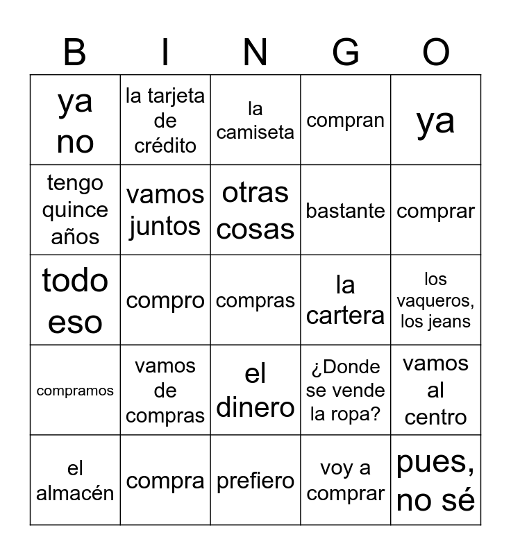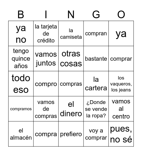 This bingo card has 25 words: vamos de compras, prefiero, otras cosas, el almacén, ya, ya no, tengo quince años, la tarjeta de crédito, la cartera, el dinero, bastante, todo eso, ¿Donde se vende la ropa?, vamos al centro, vamos juntos, pues, no sé, los vaqueros, los jeans, la camiseta, comprar, compro, compras, compra, compramos, compran and voy a comprar.