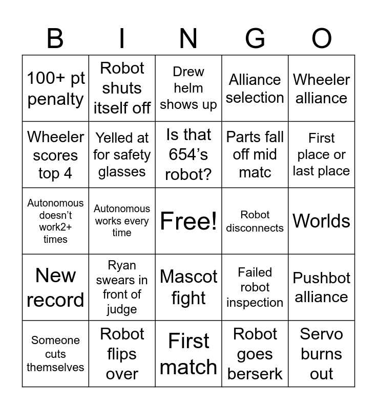 This bingo card has a free space and 24 words: Ryan swears in front of judge, Robot flips over, Is that 654’s robot?, Someone cuts themselves, Wheeler alliance, 100+ pt penalty, Wheeler scores top 4, Robot shuts itself off, Robot disconnects, Mascot fight, Parts fall off mid matc, Autonomous doesn’t work2+ times, Failed robot inspection, Pushbot alliance, Yelled at for safety glasses, Robot goes berserk, Worlds, Drew helm shows up, First place or last place, Autonomous works every time, Servo burns out, New record, Alliance selection and First match.