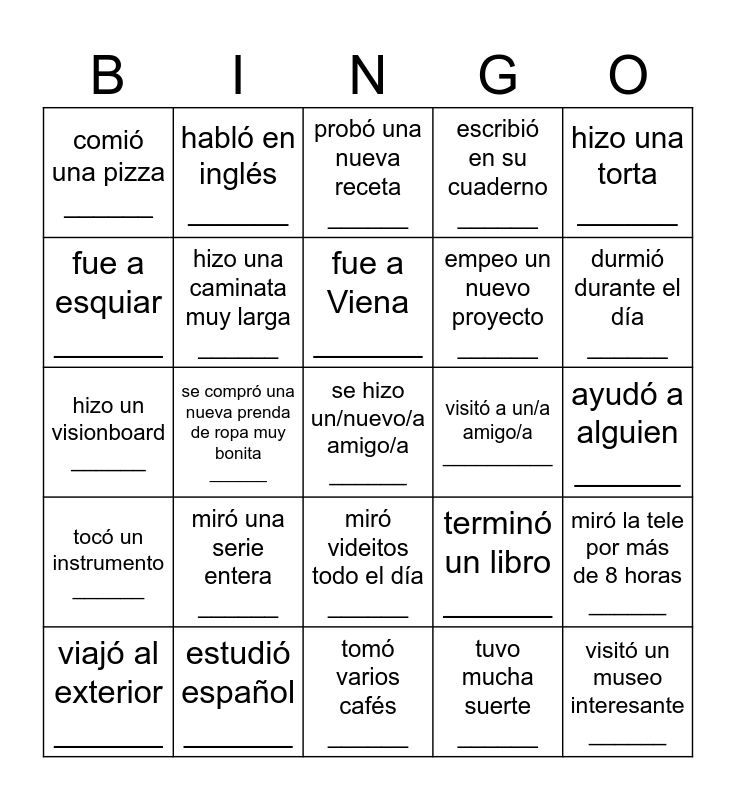 This bingo card has a free space and 24 words: miró una serie entera ______, estudió español ______, fue a Viena ______, viajó al exterior ______, hizo una torta ______, comió una pizza ______, fue a esquiar ______, habló en inglés ______, visitó a un/a amigo/a __________, miró videitos todo el día ______, empeo un nuevo proyecto ______, hizo un visionboard ______, terminó un libro ______, miró la tele por más de 8 horas ______, hizo una caminata muy larga ______, tuvo mucha suerte ______, ayudó a alguien ______, probó una nueva receta ______, durmió durante el día ______, se compró una nueva prenda de ropa muy bonita ______, visitó un museo interesante ______, tocó un instrumento ______, escribió en su cuaderno ______ and tomó varios cafés ______.