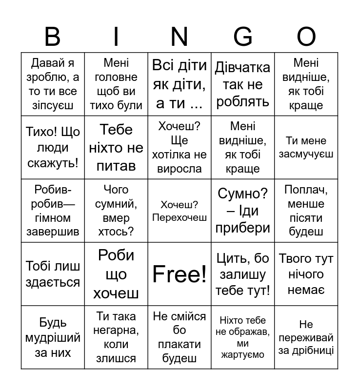 This bingo card has 26 words: Free!, Ніхто тебе не ображав, ми жартуємо, Хочеш? Ще хотілка не виросла, Ти така негарна, коли злишся, Мені видніше, як тобі краще, Давай я зроблю, а то ти все зіпсуєш, Тихо! Що люди скажуть!, Мені головне щоб ви тихо були, Поплач, менше пісяти будеш, Цить, бо залишу тебе тут!, Мені видніше, як тобі краще, Робив-робив—гімном завершив, Твого тут нічого немає, Будь мудріший за них, Чого сумний, вмер хтось?, Я тебе знаю краще, ніж ти сам, Дівчатка так не роблять, Тобі лиш здається, Всі діти як діти, а ти ..., Хочеш? Перехочеш, Ти мене засмучуєш, Не смійся бо плакати будеш, Сумно? – Іди прибери, Роби що хочеш, Тебе ніхто не питав and Не переживай за дрібниці.