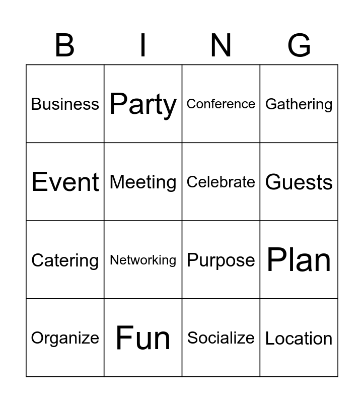 This bingo card has 26 words: Venue, Budget, Purpose, Free!, Event, Party, Celebrate, Gathering, Reception, Networking, Socialize, Guests, Music, Fun, Corporate, Client, Business, Meeting, Conference, Plan, Organize, Budget, Venue, Location, Catering and Invitations.