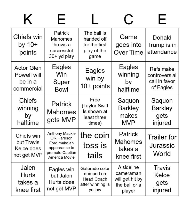 This bingo card has a free space and 79 words: Trailer for Stranger Things Season 5, Lil Wayne Performs at Halftime, The ball is handed off for the first play of the game, Eagles Defense successfully blocks a kick, Taylor Swift is shown at least three times BEFORE the game even starts, Chiefs win the coin toss, Vind Diesel and Ludacris will be in a commercial / trailer together, The first flag is on the Eagles, The ball is thrown for the first play of the game, Travis Kelce Purposes to Taylor Swift, Kendrick Lamar performs Not Like Us, David Beckham will be in a commercial, Game goes into Over Time, Chiefs win by 10+ points, Saquon Barkley makes first touchdown, Actor Glen Powell will be in a commercial, Nick Offerman is in a commercial, Anthony Mackie OR Harrison Ford make an appearance to promote Captian America Movie, the coin toss is heads, Saquon Barkley gets injured, Jason Kelce will be in a commercial, Donald Trump is in attendance, Chiefs winning by halftime, Eagles win by 10+ points, Eagles Win Super Bowl, Refs make controversial call in favor of Chiefs, Travis Kelce makes first Touchdown, Gatorade color dumped on Head Coach after winning is Blue, Eagles get first interception, Chiefs Win Super Bowl, Refs make controversial call in favor of Eagles, Tom Brady wears a solid green tie, Gatorade color dumped on Head Coach after winning is yellow, A Politician will get Boo'd by the crowd, Jalen Hurts takes a knee first, Saquon Barkley makes MVP, Kendrick Lamar performs Bad Blood with Taylor Swift, Caesars Superdome will have Technical Difficulties, Gritty (Philadelphia Flyers Mascot) will appear, Travis Kelce gets injured, Travis Kelce makes MVP, Tom Brady wears a solid red tie, The first flag is on the Chiefs, There is a Streaker, Either team uses back up Quarter Back, Patrick Mahomes throws a successful 30+ yd play, Jon Batiste performs National Anthem, Chiefs defense successfully blocks a kick, Chiefs Shutout Eagles (Eagles don't score at all), Eagles get first Field Goal, Trailer for Jurassic World, Patrick Mahomes gets MVP, Patrick Mahomes takes a knee first, Eagles Shutout Chiefs (Chiefs don't score at all), Chiefs get first Field Goal, Trailer for Fantastic Four, Jalen Hurts gets MVP, Jalen Hurts throws a successful 30+ yd play, Jalen Hurts says "I'm going to Disney World/ Land", the coin toss is tails, Eagles winning by halftime, Drake Appears during Halftime Show, Chiefs get first interception, Travis Kelce says "I'm going to Disney World/ Land", Chiefs make first incomplete pass, Eagles make first incomplete pass, Chiefs are called a Dynasty by the announcers, Chiefs win by <5 points, Eagles win by <5 points, Chiefs win but Travis Kelce does not get MVP, Eagles win but Jalen Hurts does not get MVP, Chiefs win but Patrick Mahomes does not get MVP, Eagles win but Saquon Barkley does not get MVP, Game attendees will be shown making a political protest, A commercial refers to the Super Bowl as "The Big Game", A sideline cameraman will get hit by the ball or a player, Swoop (Eagles mascot) Is shown on the screen, KC Wolf (Chiefs Mascot) is shown on the screen and someone successfully catches a Hail Mary.