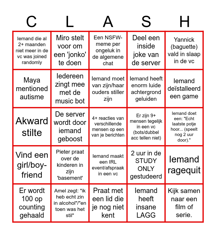 This bingo card has a free space and 24 words: Pieter praat over de kinderen in zijn 'basement', Amel zegt: "ik heb echt zin in alcohol"/"en toen was het stil", Iemand moet van zijn/haar ouders stiller zijn, Er wordt 100 op counting gehaald, Yannick (baguette) vald in slaap in de vc, Iemand die al 2+ maanden niet meer in de vc was joined randomly, Maya mentioned autisme, Miro stelt voor om een 'jonko' te doen, Er zijn 9+ mensen tegelijk in een vc (bots/dubbel acc tellen niet), Iemand maakt een IRL event/afspraak in een vc, Iemand heeft enorm luide achtergrond geluiden, Akward stilte, 2 uur in de STUDY ONLY gestudeerd, Iemand ragequit, Iedereen zingt mee met de music bot, Iemand heeft insane LAGG, Iemand doet een: "Echt laatste potje hoor... (speelt nog 2 uur door).", Een NSFW-meme per ongeluk in de algemene chat, Iemand deïstalleerd een game, De server wordt door iemand geboost, Kijk samen naar een film of serie., Vind een girl/boy-friend, Deel een inside joke van de server and Praat met een lid die je nog niet kent.