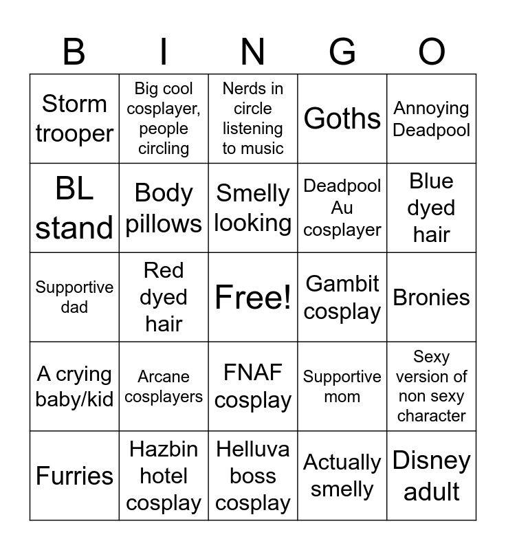 This bingo card has a free space and 24 words: Furries, Arcane cosplayers, Smelly looking, Actually smelly, Annoying Deadpool, Storm trooper, Big cool cosplayer, people circling, Nerds in circle listening to music, Gambit cosplay, Bronies, Supportive dad, Body pillows, Supportive mom, Sexy version of non sexy character, BL stand, Hazbin hotel cosplay, Helluva boss cosplay, Goths, Blue dyed hair, A crying baby/kid, Red dyed hair, FNAF cosplay, Deadpool Au cosplayer and Disney adult.