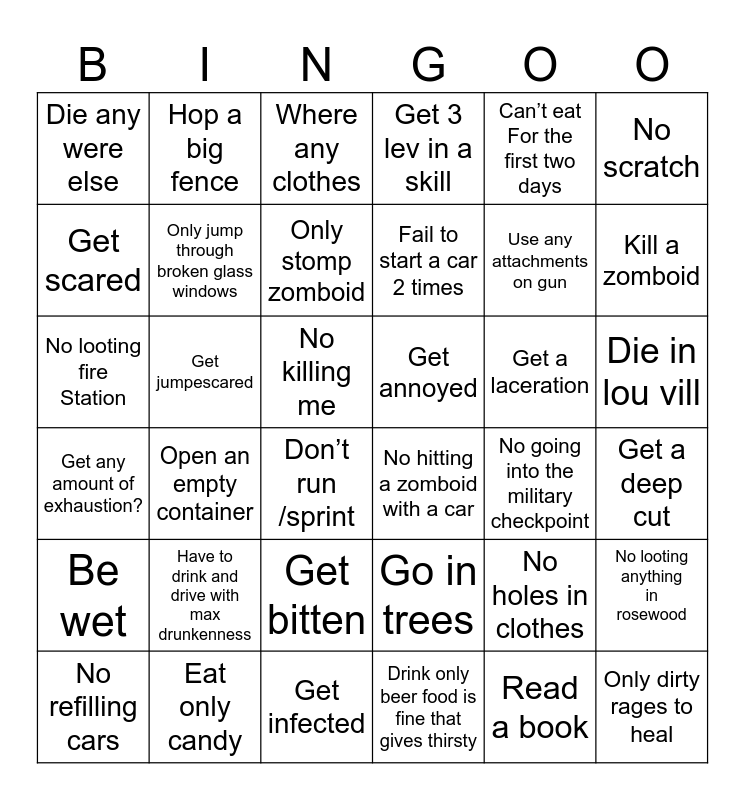 This bingo card has 36 words: Go in trees, Get bitten, Drink only beer food is fine that gives thirsty, Get scared, Get any amount of exhaustion?, Get annoyed, Only jump through broken glass windows, Get infected, Can’t eat For the first two days, No holes in clothes, Kill a zomboid, Get 3 lev in a skill, No looting anything in rosewood, Get jumpescared, Fail to start a car 2 times, Die any were else, Be wet, Get a laceration, No looting fire Station, Where any clothes, No killing me, Open an empty container, No hitting a zomboid with a car, Don’t run /sprint, No going into the military checkpoint, Hop a big fence, Use any attachments on gun, Eat only candy, Only stomp zomboid, No scratch, Only dirty rages to heal, No refilling cars, Get a deep cut, Die in lou vill, Have to drink and drive with max drunkenness and Read a book.