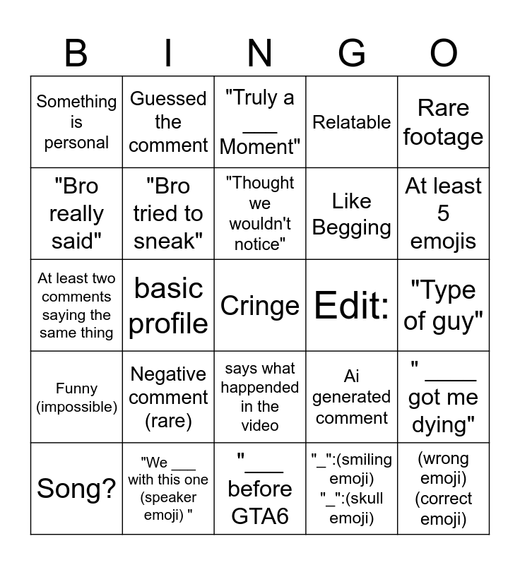 This bingo card has a free space and 24 words: Negative comment (rare), "We ___ with this one (speaker emoji) ", "Thought we wouldn't notice", Song?, Rare footage, Something is personal, "Bro really said", Guessed the comment, Edit:, says what happended in the video, Like Begging, At least two comments saying the same thing, Ai generated comment, " ____ got me dying", "Bro tried to sneak", "_":(smiling emoji) "_":(skull emoji), "Type of guy", "Truly a ___ Moment", At least 5 emojis, basic profile, (wrong emoji) (correct emoji), Funny (impossible), Relatable and "___ before GTA6.