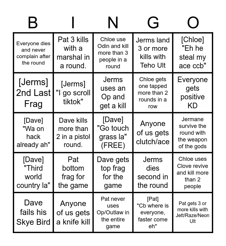 This bingo card has a free space and 24 words: Pat bottom frag for the game, Anyone of us gets a knife kill, Jerms uses an Op and get a kill, Dave fails his Skye Bird, [Chloe] "Eh he steal my ace ccb", Everyone dies and never complain after the round, [Jerms] 2nd Last Frag, Pat 3 kills with a marshal in a round., Anyone of us gets clutch/ace, Dave gets top frag for the game, Chloe gets one tapped more than 2 rounds in a row, [Dave] "Wa on hack already ah", Jerms dies second in the round, Chloe uses Clove revive and kill more than 2 people, [Jerms] "I go scroll tiktok", [Pat] "Cb where is everyone, faster come eh", Jermane survive the round with the weapon of the gods, Chloe use Odin and kill more than 3 people in a round, Everyone gets positive KD, Dave kills more than 2 in a pistol round., Pat gets 3 or more kills with Jett/Raze/Neon Ult, [Dave] "Third world country la", Jerms land 3 or more kills with Teho Ult and Pat never uses Op/Outlaw in the entire game.