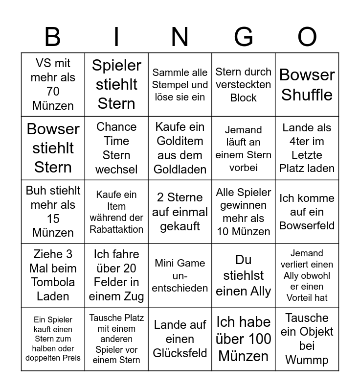 This bingo card has a free space and 24 words: Ich fahre über 20 Felder in einem Zug, Tausche Platz mit einem anderen Spieler vor einem Stern, Kaufe ein Golditem aus dem Goldladen, Ein Spieler kauft einen Stern zum halben oder doppelten Preis, Bowser Shuffle, VS mit mehr als 70 Münzen, Bowser stiehlt Stern, Spieler stiehlt Stern, Alle Spieler gewinnen mehr als 10 Münzen, Mini Game un- entschieden, Jemand läuft an einem Stern vorbei, Buh stiehlt mehr als 15 Münzen, Du stiehlst einen Ally, Jemand verliert einen Ally obwohl er einen Vorteil hat, Chance Time Stern wechsel, Ich habe über 100 Münzen, Ich komme auf ein Bowserfeld, Sammle alle Stempel und löse sie ein, Lande als 4ter im Letzte Platz laden, Kaufe ein Item während der Rabattaktion, Tausche ein Objekt bei Wummp, Ziehe 3 Mal beim Tombola Laden, Stern durch versteckten Block and Lande auf einen Glücksfeld.
