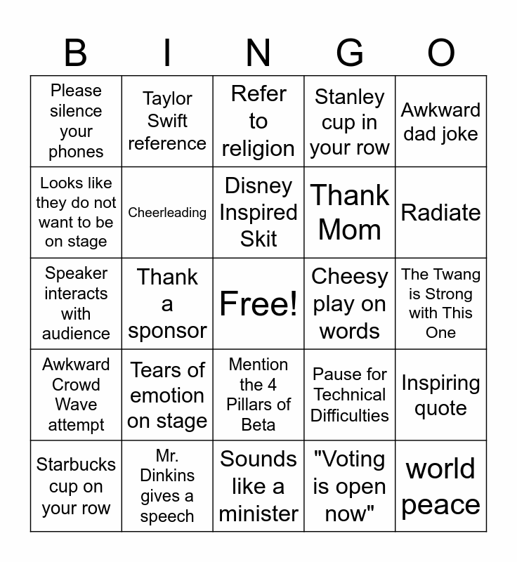 This bingo card has a free space and 30 words: Mr. Dinkins gives a speech, Orlando for National Convention, Thank a sponsor, Dancing Before a session, Please silence your phones, Refer to religion, Cheerleading, Mention the 4 Pillars of Beta, Cheesy play on words, Sounds like a minister, The Twang is Strong with This One, world peace, "Voting is open now", Prop Mishap, Radiate, "Let us lead by serving others", Pause for Technical Difficulties, Awkward Crowd Wave attempt, Tears of emotion on stage, Awkward dad joke, Speaker interacts with audience, Music through the Decades in one performance, Taylor Swift reference, Thank Mom, Looks like they do not want to be on stage, Stanley cup in your row, Inspiring quote, Starbucks cup on your row, Disney Inspired Skit and Name mispronounced.