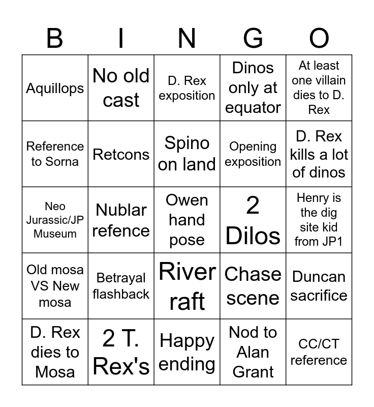 This bingo card has a free space and 24 words: Betrayal flashback, 2 T. Rex's, Spino on land, D. Rex dies to Mosa, At least one villain dies to D. Rex, Aquillops, Reference to Sorna, No old cast, 2 Dilos, River raft, Opening exposition, Neo Jurassic/JP Museum, Chase scene, Duncan sacrifice, Retcons, Nod to Alan Grant, Henry is the dig site kid from JP1, D. Rex exposition, D. Rex kills a lot of dinos, Nublar refence, CC/CT reference, Old mosa VS New mosa, Dinos only at equator and Happy ending.