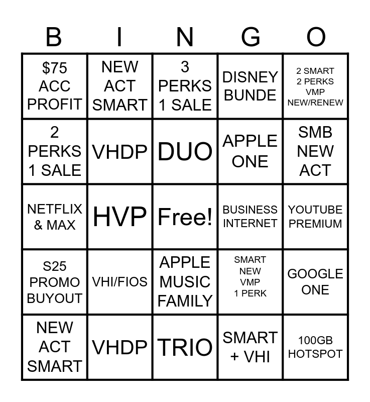 This bingo card has a free space and 24 words: VHI/FIOS, VHDP, DUO, NEW ACT SMART, 2 SMART 2 PERKS VMP NEW/RENEW, $75 ACC PROFIT, 2 PERKS 1 SALE, NEW ACT SMART, BUSINESS INTERNET, APPLE MUSIC FAMILY, APPLE ONE, NETFLIX & MAX, SMART NEW VMP 1 PERK, GOOGLE ONE, VHDP, SMART + VHI, YOUTUBE PREMIUM, 3 PERKS 1 SALE, SMB NEW ACT, HVP, 100GB HOTSPOT, S25 PROMO BUYOUT, DISNEY BUNDE and TRIO.
