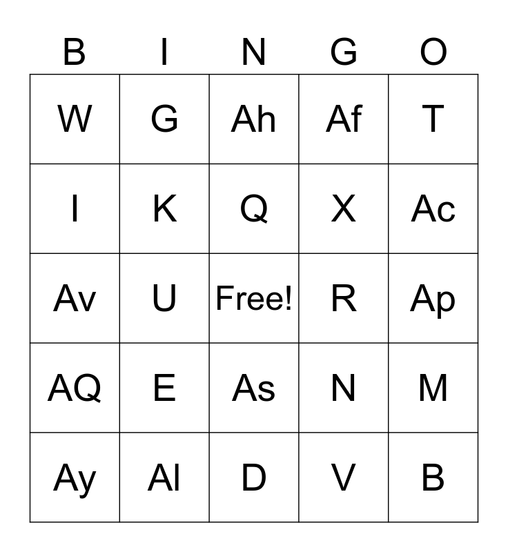 This bingo card has a free space and 52 words: A, B, C, D, E, F, G, H, I, J, K, L, M, N, O, P, Q, R, S, T, U, V, W, X, Y, Z, Aa, Ab, Ac, Ad, Ar, Af, Ah, Ah, Ai, Ah, Al, Al, Am, An, Ao, Ap, AQ, Ar, As, At, Au, Av, Aw, Ax, Ay and Az.