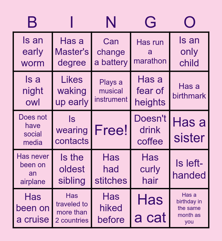 This bingo card has a free space and 32 words: Has a cat, Is a vegetarian or vegan, Is wearing contacts, Has a food allergy, Has never been on an airplane, Likes waking up early, Is an only child, Is left-handed, Has a Master's degree, Is the youngest sibling, Plays a musical instrument, Can change a battery, Can speak more than 1 language, Has a dog, Doesn't drink coffee, Played a sport in high school, Has been on a cruise, Does not have social media, Has had stitches, Is the oldest sibling, Has curly hair, Has a brother, Has a sister, Has traveled to more than 2 countries, Has a birthday in the same month as you, Has run a marathon, Has a fear of heights, Is a night owl, Is an early worm, Has hiked before, Is a volunteer and Has a birthmark.
