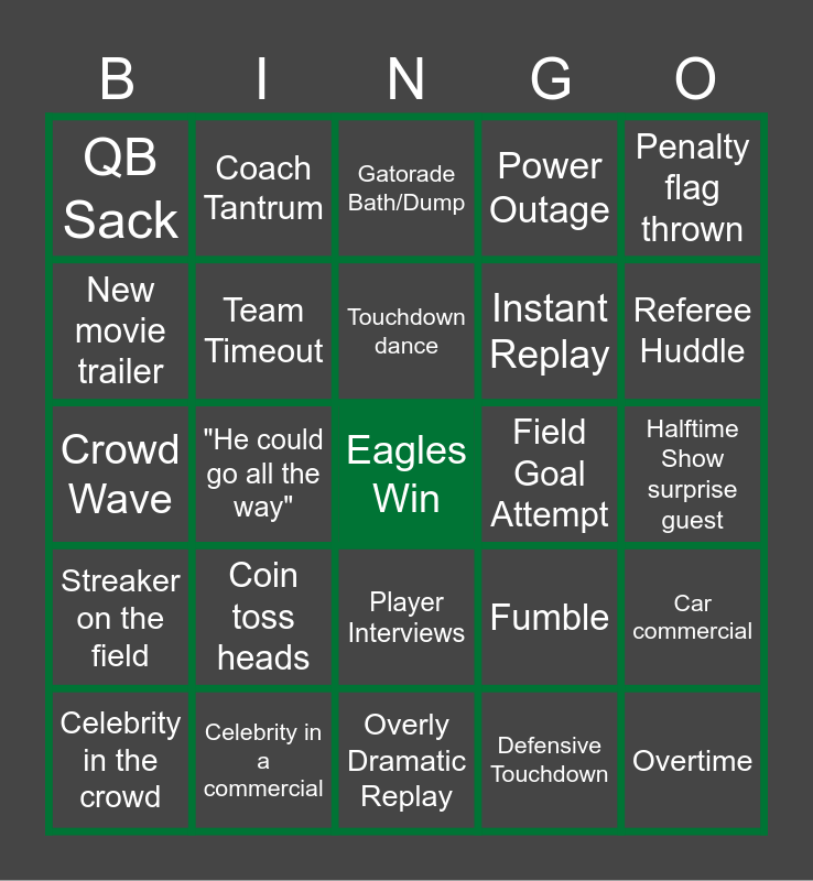 This bingo card has a free space and 24 words: Coin toss heads, Celebrity in a commercial, Touchdown dance, Celebrity in the crowd, Penalty flag thrown, QB Sack, New movie trailer, Coach Tantrum, Field Goal Attempt, Player Interviews, Instant Replay, Crowd Wave, Fumble, Car commercial, Team Timeout, Defensive Touchdown, Halftime Show surprise guest, Gatorade Bath/Dump, Referee Huddle, "He could go all the way", Overtime, Streaker on the field, Power Outage and Overly Dramatic Replay.