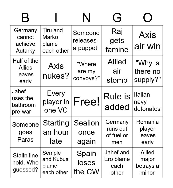 This bingo card has a free space and 24 words: Starting an hour late, Semple and Kubua blame each other, "Where are my convoys?", Stalin line hold. Who guessed?, Axis air win, Germany cannot achieve Autarky, Half of the Allies leaves early, Tiru and Marko blame each other, Rule is added, Sealion once again, Allied air stomp, Jahef uses the bathroom pre-war, Germany runs out of fuel or men, Romania player leaves early, Axis nukes?, Jahef and Ero blame each other, Italian navy detonates, Someone releases a puppet, "Why is there no supply?", Every player in one VC, Allied major betrays a minor, Someone goes Paras, Raj gets famine and Spain loses the CW.