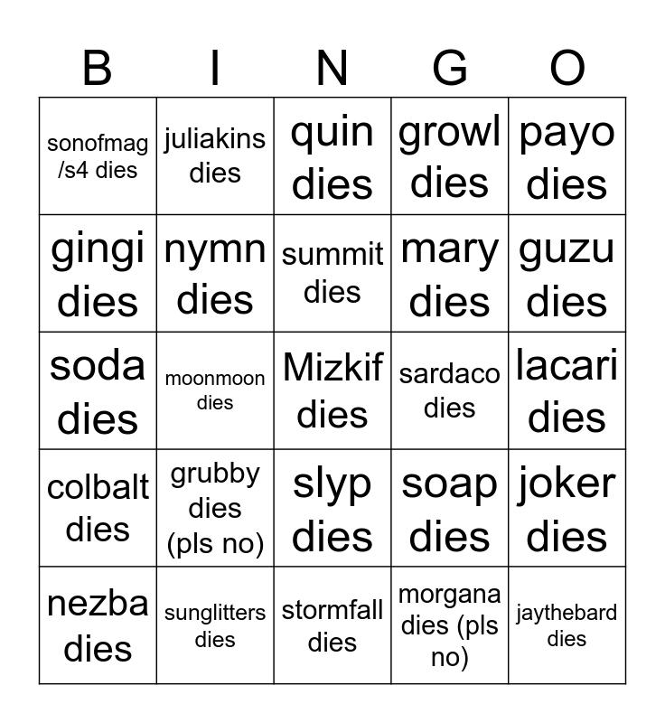 This bingo card has a free space and 24 words: grubby dies (pls no), sunglitters dies, summit dies, nezba dies, payo dies, sonofmag /s4 dies, gingi dies, juliakins dies, sardaco dies, slyp dies, mary dies, soda dies, soap dies, joker dies, nymn dies, morgana dies (pls no), lacari dies, quin dies, guzu dies, moonmoon dies, jaythebard dies, colbalt dies, growl dies and stormfall dies.
