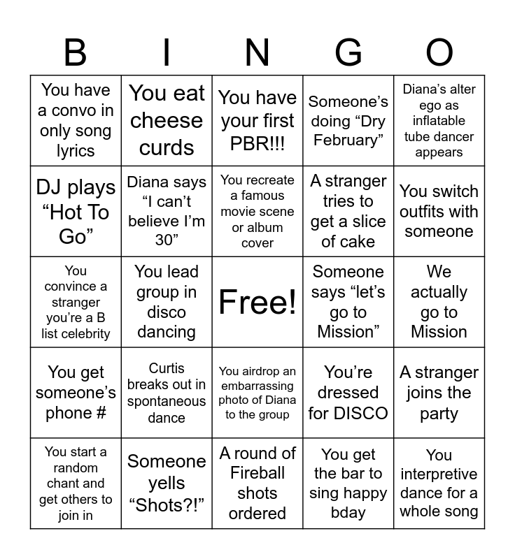 This bingo card has a free space and 24 words: Curtis breaks out in spontaneous dance, Someone yells “Shots?!”, You recreate a famous movie scene or album cover, You start a random chant and get others to join in, Diana’s alter ego as inflatable tube dancer appears, You have a convo in only song lyrics, DJ plays “Hot To Go”, You eat cheese curds, Someone says “let’s go to Mission”, You airdrop an embarrassing photo of Diana to the group, A stranger tries to get a slice of cake, You convince a stranger you’re a B list celebrity, You’re dressed for DISCO, A stranger joins the party, Diana says “I can’t believe I’m 30”, You get the bar to sing happy bday, We actually go to Mission, You have your first PBR!!!, You switch outfits with someone, You lead group in disco dancing, You interpretive dance for a whole song, You get someone’s phone #, Someone’s doing “Dry February” and A round of Fireball shots ordered.