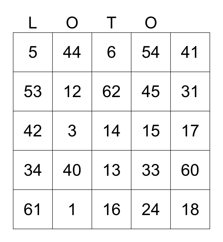 This bingo card has a free space and 30 words: 1, 2, 3, 4, 5, 6, 12, 13, 15, 16, 17, 18, 24, 30, 31, 32, 33, 34, 40, 41, 42, 43, 44, 45, 53, 54, 60, 61, 62 and 69.