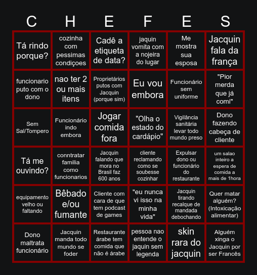 This bingo card has 36 words: "eu nunca vi isso na minha vida", Cliente com cara de que tem podcast de games, pessoa nao entende o jaquin sem legenda, funcionario puto com o dono, Tá me ouvindo?, "Olha o estado do cardápio", nao ter 2 ou mais itens, Restaurante árabe tem comida que não é árabe, Me mostra sua esposa, Jacquin tirando recalque de mandada debochando, "Pior merda que já comi", jaquin vomita com a nojeira do lugar, Quer matar alguém? (Intoxicação alimentar), Funcionário indo embora, Eu vou embora, Tá rindo porque?, equipamento velho ou faltando, Vigilância sanitária levar todo mundo preso, Sem Sal/Tompero, Cadê a etiqueta de data?, Jogar comida fora, conntratar familia como funcionarios, cliente reclamando como se soubesse cozinhar, Jacquin falando que mora no Brasil faz 600 anos, Expulsar dono ou funcionário do restaurante, cozinha com pessimas condiçoes, Funcionário sem uniforme, Jacquin manda todo mundo se foder, Proprietários putos com Jacquin (porque sim), Jacquin fala da frança, Alguém xinga o Jacquin por ser Francês, Dono maltrata funcionário, um salao inteiro a espera de comida a mais de 1hora, Dono fazendo cabeça de cliente, Bêbado e/ou fumante and skin rara do jacquin.