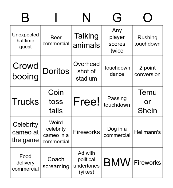 This bingo card has a free space and 31 words: Ad with political undertones (yikes), Coin toss heads, Coin toss tails, Jets flyover, Unexpected halftime guest, Talking animals, Doritos, Dog in a commercial, Passing touchdown, BMW, Temu or Shein, Fireworks, Budweiser Clyesdales, Cringy commercial, 2 point conversion, Play reviewed, Hellmann's, Weird celebrity cameo in a commercial, Celebrity cameo at the game, Fireworks, Rushing touchdown, Field goal missed, Food delivery commercial, Beer commercial, Touchdown dance, Crowd booing, Any player scores twice, Trucks, Coach screaming, Overhead shot of stadium and Commercial that tugs on the heartstrings.