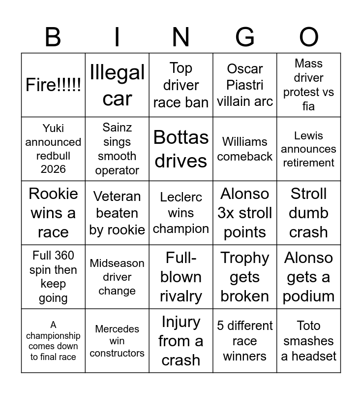 This bingo card has 25 words: Midseason driver change, Injury from a crash, Bottas drives, A championship comes down to final race, Mass driver protest vs fia, Fire!!!!!, Yuki announced redbull 2026, Illegal car, Alonso 3x stroll points, Full-blown rivalry, Williams comeback, Rookie wins a race, Trophy gets broken, Alonso gets a podium, Sainz sings smooth operator, Toto smashes a headset, Stroll dumb crash, Top driver race ban, Lewis announces retirement, Veteran beaten by rookie, Leclerc wins champion, Mercedes win constructors, Full 360 spin then keep going, Oscar Piastri villain arc and 5 different race winners.