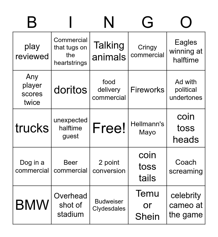 This bingo card has a free space and 28 words: Coach screaming, Weird celebrity cameo in a commercial, Fireworks, Temu or Shein, Any player scores twice, Talking animals, Commercial that tugs on the heartstrings, Dog in a commercial, Hellmann's Mayo, BMW, trucks, Cringy commercial, Overhead shot of stadium, Budweiser Clydesdales, Ad with political undertones, Rushing touchdown, Beer commercial, doritos, food delivery commercial, 2 point conversion, play reviewed, jets flyover, celebrity cameo at the game, unexpected halftime guest, coin toss heads, coin toss tails, Eagles winning at halftime and Chiefs winning at halftime.