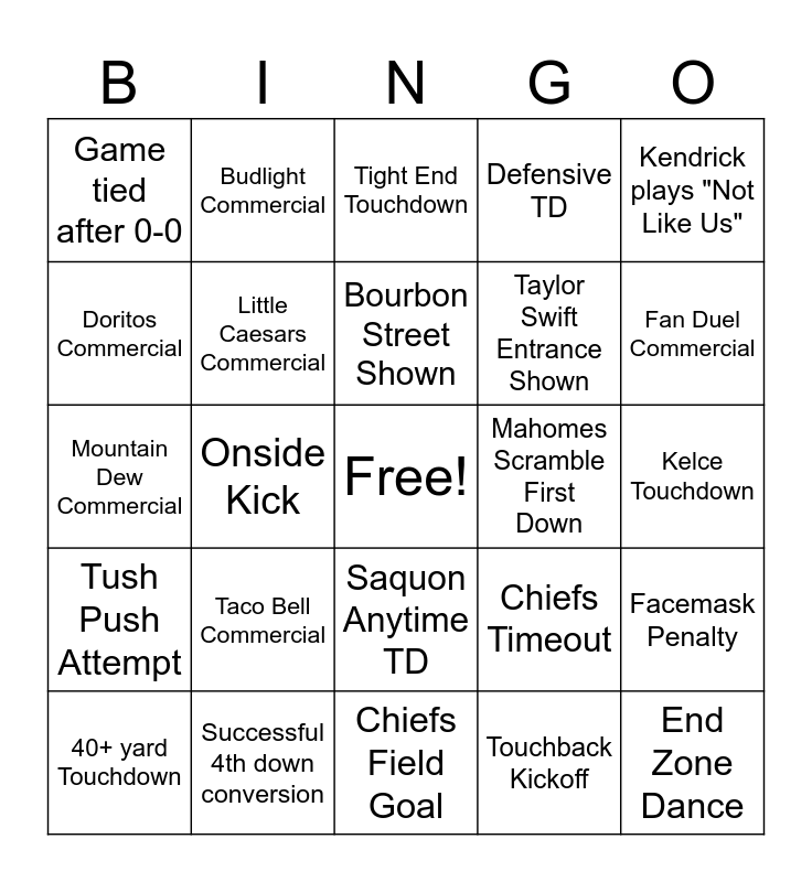 This bingo card has a free space and 54 words: Chiefs False Start Penalty, Tush Push Attempt, 2 point conversion, Mahomes Interception, Saquon Anytime TD, Any team scores 20+, Defensive TD, Hurts Interception, Doritos Commercial, Budweiser Commercial, Game tied after 0-0, Penalty Reversal, Successful 4th down conversion, 40+ yard Touchdown, Eagles Field Goal, Chiefs Field Goal, End Zone Dance, Taylor Swift Entrance Shown, Fumble, Kelce Touchdown, Chiefs Timeout, Eagles Timeout, Mahomes Scramble First Down, Kendrick plays "Not Like Us", One Handed Catch, Budlight Commercial, Offsides Penalty, Quarterback Sack, DoorDash commercial, Touchback Kickoff, SalesForce Commercial, M&Ms commercial, Missed Extra Point, Overhead Shot of Stadium, Tight End Touchdown, Wide Receiver TD, Mountain Dew Commercial, Facemask Penalty, Kendrick does "Squabble Up", Little Caesars Commercial, Brittney Mahomes Shown, Chris Jones Shown Crying, Nick Sirianni Crying, Kareem Hunt Does Pushup, Taco Bell Commercial, Referee Huddle, Running Back Touchdown, Fake Punt, Bourbon Street Shown, Onside Kick, Fan Duel Commercial, PrizePicks Commercial, Cheer Leaders Shown and Special Teams Touchdown.