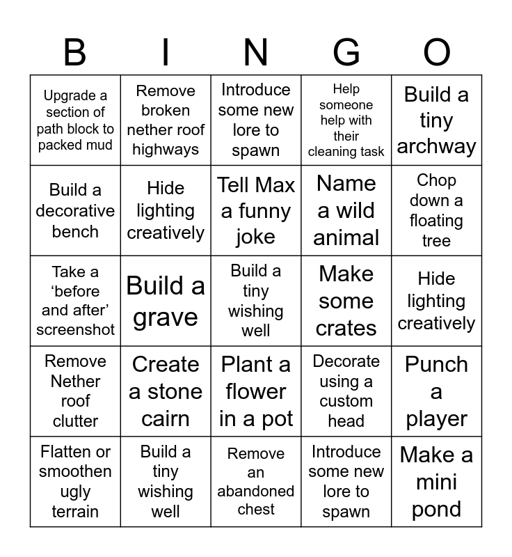 This bingo card has 57 words: Free!, Flatten or smoothen ugly terrain, Remove a sign with outdated info on it, Upgrade a section of path block to packed mud, Remove an abandoned chest, Remove an abandoned crafting table, Hide lighting creatively, Build a decorative bench, Name a wild animal, Take a ‘before and after’ screenshot, Help someone help with their cleaning task, Remove Nether roof clutter, Remove broken nether roof highways, Plant a flower in a pot, Make a mini pond, Make a small campfire area, Build a tiny archway, Build a grave, Create a stone cairn, Build a tiny wishing well, Make some crates, Make a retaining wall, Decorate using a custom head, Introduce some new lore to spawn, Fix some ugly terrain, Tell Max a funny joke, Find a diamond block, Punch a player, Chop down a floating tree, Flatten or smoothen ugly terrain, Remove a sign with outdated info on it, Upgrade a section of path block to packed mud, Remove an abandoned chest, Remove an abandoned crafting table, Hide lighting creatively, Build a decorative bench, Name a wild animal, Take a ‘before and after’ screenshot, Help someone help with their cleaning task, Remove Nether roof clutter, Remove broken nether roof highways, Plant a flower in a pot, Make a mini pond, Make a small campfire area, Build a tiny archway, Build a grave, Create a stone cairn, Build a tiny wishing well, Make some crates, Make a retaining wall, Decorate using a custom head, Introduce some new lore to spawn, Fix some ugly terrain, Tell Max a funny joke, Find a diamond block, Punch a player and Chop down a floating tree.