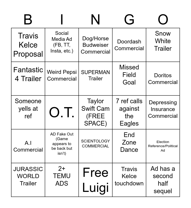 This bingo card has a free space and 24 words: AD Fake Out (Game appears to be back but isn’t), 2+ TEMU ADS, SUPERMAN Trailer, JURASSIC WORLD Trailer, Snow White Trailer, Travis Kelce Proposal, Fantastic 4 Trailer, Social Media Ad (FB, TT, Insta, etc.), 7 ref calls against the Eagles, SCIENTOLOGY COMMERCIAL, Missed Field Goal, Someone yells at ref, End Zone Dance, Election Reference/Political Ad, Weird Pepsi Commercial, Travis Kelce touchdown, Depressing Insurance Commercial, Dog/Horse Budweiser Commercial, Doritos Commercial, O.T., Ad has a second half sequel, A.I Commercial, Doordash Commercial and Free Luigi.