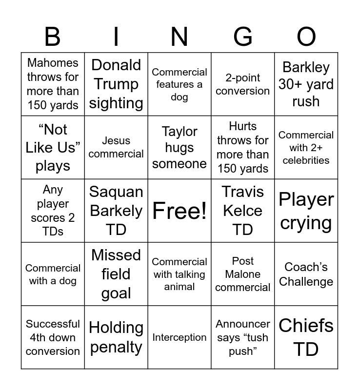 This bingo card has a free space and 46 words: Car commercial, Chiefs TD, Eagles TD, Interception, Missed field goal, Concussion protocol, Donald Trump sighting, Fumble, “Not Like Us” plays, Coach covers mouth with play card, Jesus commercial, 2-point conversion, Coach’s Challenge, Post Malone commercial, Taylor Swift song reference, Dunkin commercial, Taylor hugs someone, Travis Kelce TD, Sack, Barkley 30+ yard rush, Saquan Barkely TD, Announcer says “tush push”, Mahomes throws for more than 150 yards, Hurts throws for more than 150 yards, Player has over 100 receiving yards, Commercial with 2+ celebrities, Successful 4th down conversion, Someone celebrates a TD in the endzone, Commercial with talking animal, Commercial with a dog, Worthy TD, Doritos commercial, FanDuel or DraftKings commercial, First down measurement, False start penalty, Holding penalty, Player crying, Gordon Ramsey commercial, Budweiser commercial, Pepsi commercial, Coke commercial, Commercial features a dog, Any player scores 2 TDs, Hunt TD, QB Rushing TD and Announcers talk about the Kelce brothers.