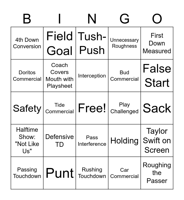 This bingo card has a free space and 34 words: 20+ Yard Pass, Car Commercial, Player Scores 2+ Touchdowns, Missed Extra Point, Halftime Show: "Not Like Us", Coach Covers Mouth with Playsheet, First Down Measured, Passing Touchdown, Field Goal, Fumble, Interception, Tush-Push, 20+ Yard Run, 50+ Yard Touchdown, Play Challenged, False Start, Punt, Safety, Defensive TD, Holding, Pass Interference, Ineligible Man Downfield, 4th Down Conversion, Sack, Rushing Touchdown, Roughing the Passer, Unnecessary Roughness, Tackle for a Loss, Bud Commercial, Doritos Commercial, Funny Commercial, Tide Commercial, Taylor Swift on Screen and Sad Commercial.