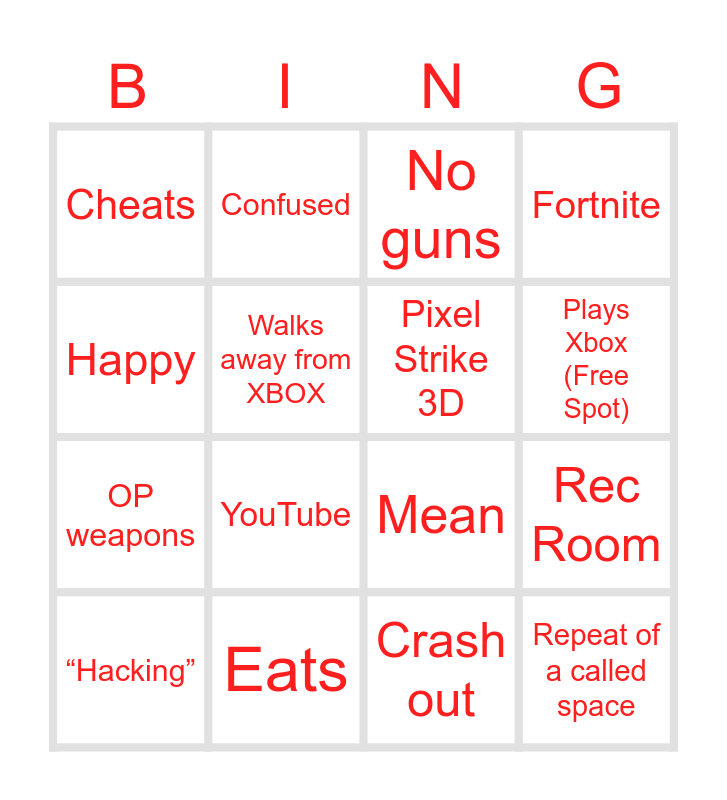 This bingo card has 17 words: Crash out, “Hacking”, No guns, Cheats, YouTube, Fortnite, Rec Room, Pixel Strike 3D, Plays Xbox (Free Spot), Walks away from XBOX, Eats, Mean, Happy, Confused, OP weapons, Gets bunch of kills and Repeat of a called space.