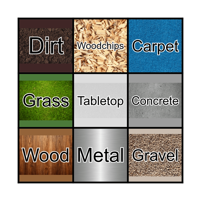 This bingo card has 8 images, a free space and 8 words: Concrete, Carpet, Woodchips, Wood, Dirt, Gravel, Grass and Metal.