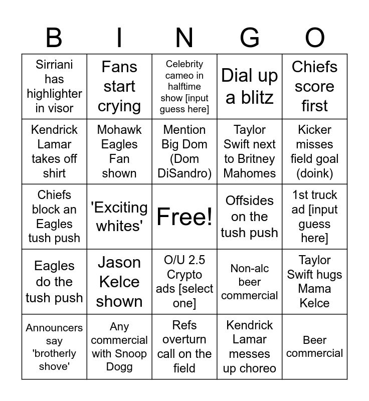 This bingo card has a free space and 28 words: Taylor Swift hugs Mama Kelce, Taylor Swift brings celebrity +1, Taylor Swift next to Britney Mahomes, Kendrick Lamar messes up choreo, Kendrick Lamar takes off shirt, Celebrity cameo in halftime show [input guess here], Fans start crying, Eagles do the tush push, Offsides on the tush push, Announcers say 'brotherly shove', Chiefs block an Eagles tush push, Dial up a blitz, Any commercial with Snoop Dogg, Refs overturn call on the field, Kicker misses field goal (doink), Move the chains, Jason Kelce shown, Mohawk Eagles Fan shown, Mention Big Dom (Dom DiSandro), O/U 2.5 Crypto ads [select one], Sirriani has highlighter in visor, 'Inner Excellence' mention, Beer commercial, 'Exciting whites', 1st truck ad [input guess here], Non-alc beer commercial, Chiefs score first and Eagles score first.