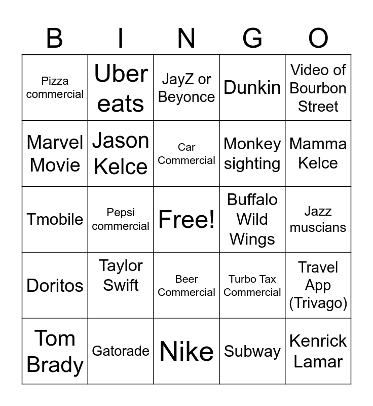 This bingo card has a free space and 24 words: Taylor Swift, Gatorade, Car Commercial, Tom Brady, Video of Bourbon Street, Pizza commercial, Marvel Movie, Uber eats, Buffalo Wild Wings, Beer Commercial, Monkey sighting, Tmobile, Turbo Tax Commercial, Travel App (Trivago), Jason Kelce, Subway, Jazz muscians, JayZ or Beyonce, Mamma Kelce, Pepsi commercial, Kenrick Lamar, Doritos, Dunkin and Nike.